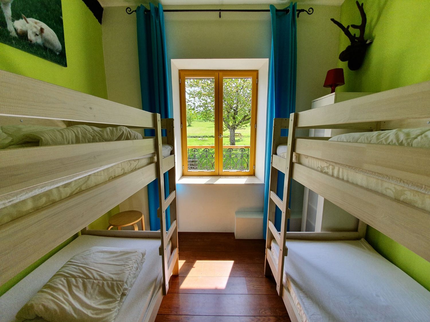“A la campagne” is een kleine 4-persoons slaapkamer met 2 stapelbedden (4x90/200 cm). Door de kleuren, de aankleding en het fraaie landelijke uitzicht, waan je je hier op het Franse platteland. Deze kamer is met name geschikt als slaapkamer voor kinderen. Er bevindt zich hier een smalle garderobekast.